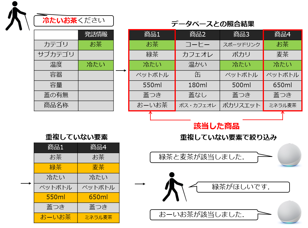 商品の特定は図4のような手順で行われる.利用者が「冷たいお茶ください」と発言した場合,商品の特定を行うために必要な情報として「冷たい」と「お茶」を発話から獲得する.